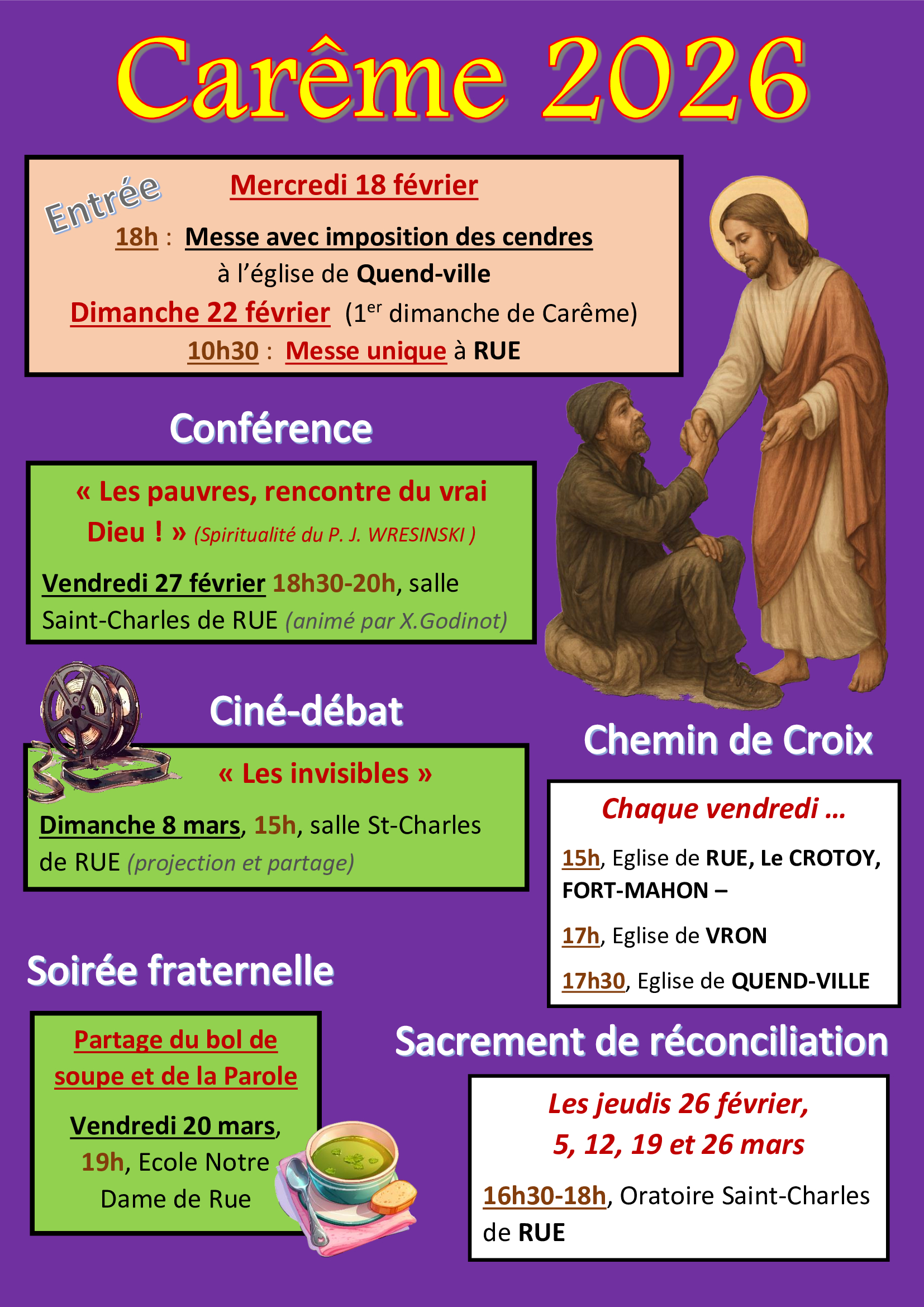 Bonjour à tous, mercredi 18 février l'Eglise commencera le temps du Carême par l'imposition des cendres. Plusieurs propositions vous sont offertes pour vivre ce temps de grâce et de conversion. Comme chaque année, des chemins de croix seront animés chaque vendredi dans plusieurs églises de la paroisse.