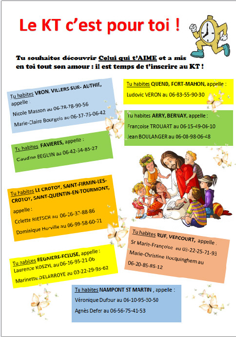 à la demande de Nicole, vous trouverez en pièce jointe l'affiche qui concerne la rentrée du KT. Merci de partager cette information au maximum. Le KT c'est important ! Le KT c'est pour tous les enfants (même non baptisés) ! Le KT c'est l'affaire de tous ceux qui souhaitent que soit proclamée la Bonne Nouvelle du Christ ressuscité ! Devant le trop peu d'inscrits, nous avons besoin de vous ! Osez toquer à la porte de vos voisins pour leur donner cette petite affiche. La foi n'est pas une affaire privée, elle fait partie de l'être chrétien et se partage autour de soi. "On allume pas une lampe pour la mettre sous le boisseau (Matthieu 5, 14-15)" Au contraire, la lumière de notre foi doit illuminer ce monde en quête de sens !